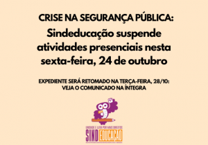 Em razão da crise na Segurança Pública deflagrada pela guerra de facções em São Luís, o Sindeducação, preventivamente, e seguindo as medidas de segurança adotadas por outras instituições, não terá expediente administrativo em sua Sede nesta sexta-feira, 24 de outubro de 2025.