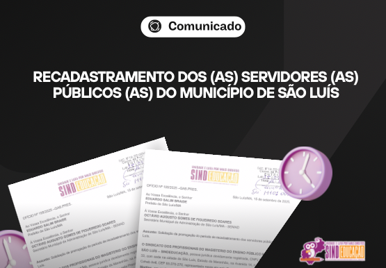 O Sindeducação informa aos (às) professores (as) da rede pública municipal de São Luís — tendo em vista que o Recadastramento dos (as) Servidores (as) Públicos (as) encerra-se nesta sexta-feira, 19 de setembro de 2025 e que este processo tem gerado transtornos e filas de espera, em razão da grande demanda, de necessidade de reagendamento para apresentação de documentação, da inserção de novos servidores e de que no link para agendamento não existem vagas e muitos (as) não conseguem encaixe nos postos de atendimento, presencialmente, que já foi protocolado junto à Prefeitura de São Luís um pedido formal de ampliação do prazo estabelecido para o referido procedimento.